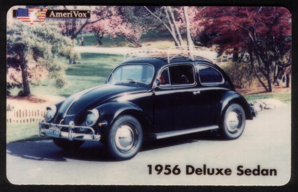 The card includes the text "vw beetle deluxe sedan" in lowercase across the front, directly identifying the model. Additional text at the bottom includes "1956 deluxe sedan," reaffirming the specific year and style of this Volkswagen. The brand "AmeriVox" is visible in the lower corner, indicating the manufacturer or distributor of the card. The overall presentation emphasizes the classic design and appeal of the 1956 Volkswagen Beetle as an automobile and collector’s item.