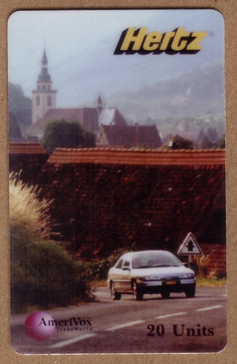The card prominently displays the Hertz logo in the top right corner, indicating a connection to Hertz rental cars. At the bottom left of the card is the AmeriVox Telecard logo, and the card value is marked as "20 Units" in the bottom right corner. The overall scene implies a travel or transportation theme, consistent with Hertz car rentals and the AmeriVox brand.