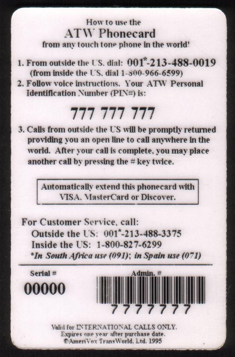 Since we have the world's largest inventory of USA phonecards for collectors, you will not necessarily receive the identical serial/batch/PIN number that we have scanned/pictured.