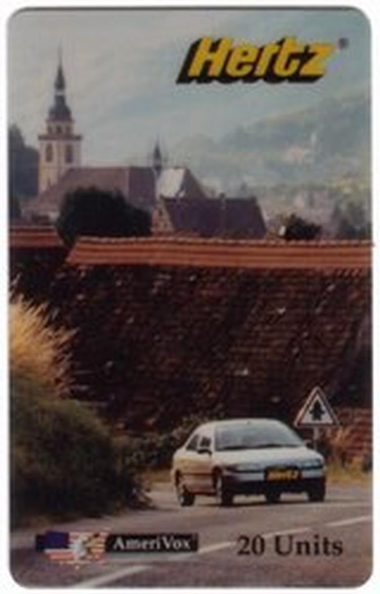 This collectible phone card features prominently the branding of Hertz Rental Cars and showcases the association with ATW TransWorld. The card includes the names AmeriVox and ATW, emphasizing a promotional connection with travel and transportation, particularly focusing on automobiles. The text "20u Hertz Rental Cars" is displayed, indicating the card’s value or units, reinforcing its usage in the context of rental car services.