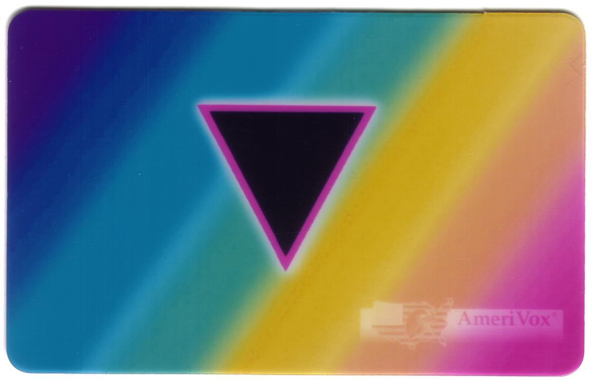 This collectible phone card features prominent LGBT rights artwork titled "Somewhere Over The Rainbow With Triangle PROOF" by AmeriVox. The design centers on a vivid rainbow arc that stretches across the top portion of the card, symbolizing diversity and pride within the LGBTQ community. Positioned beneath the rainbow is a pink triangle, historically recognized as a symbol of gay rights and the struggle against discrimination.