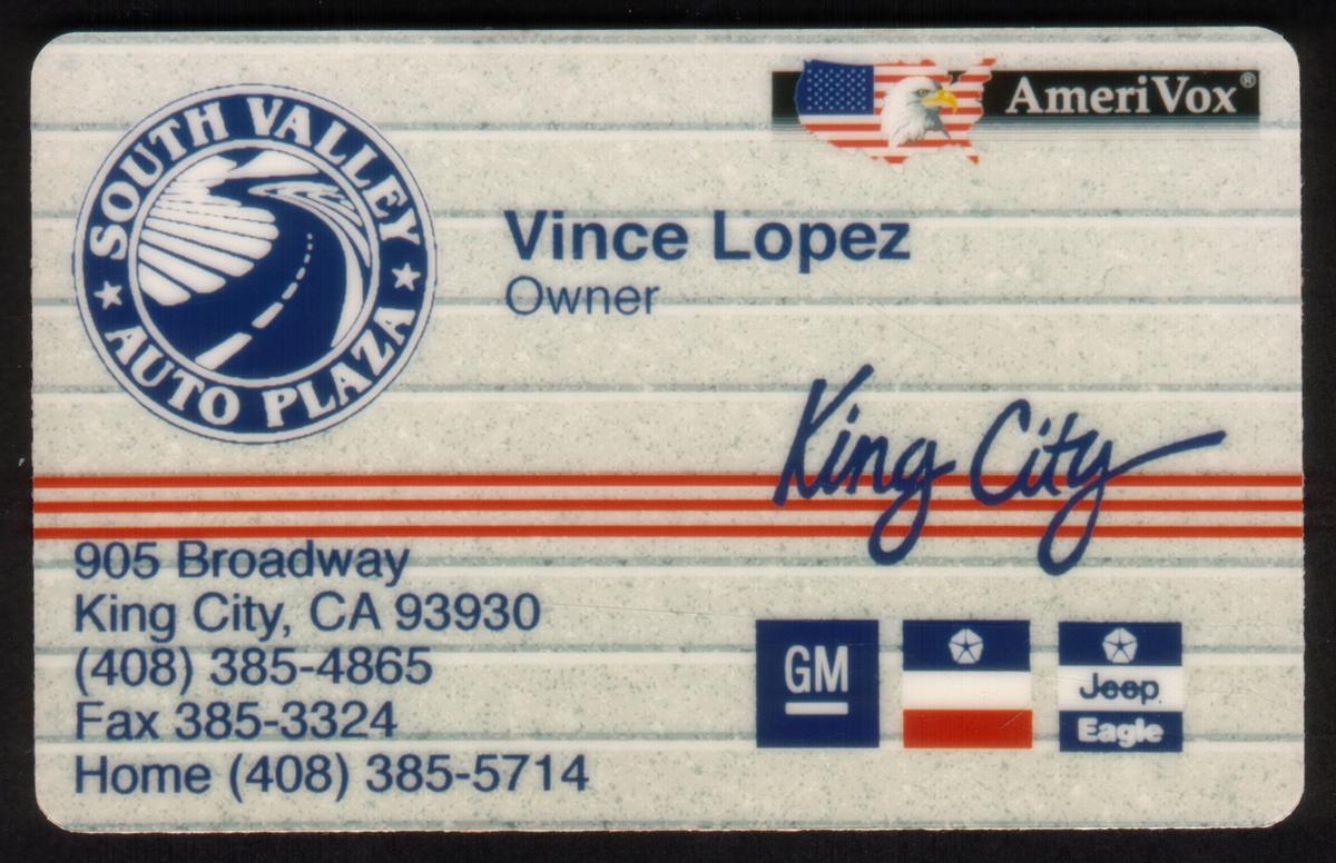 This collectible card features corporate branding for South Valley Auto Plaza, prominently associated with Vince Lopez in King City, California. The card highlights various automotive brands including GM, Jeep Eagle, and Chrysler, reflecting its connection to the transportation and automobile industry. The design cleanly presents the auto dealership's name and the key person, Vince Lopez, emphasizing a professional corporate business card style.