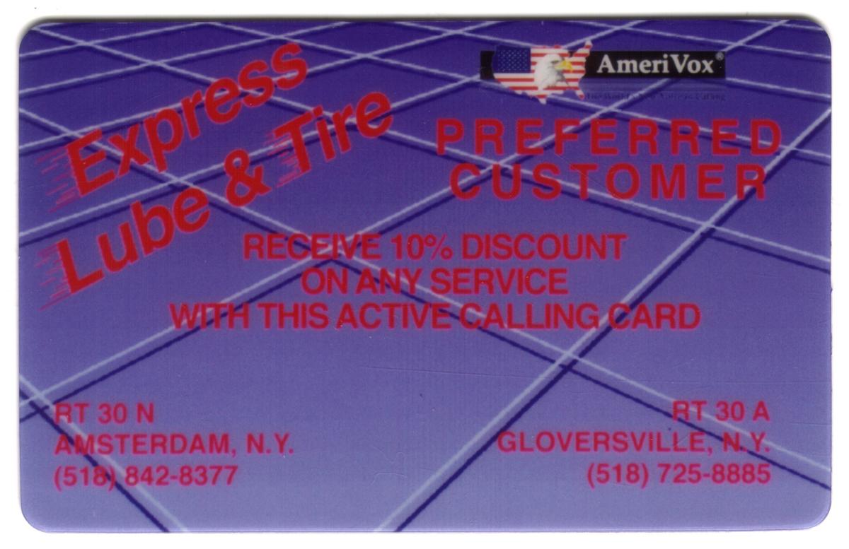 This collectible card is associated with AmeriVox and is marked as a proof, indicating it is a sample or test print of the discount card. The overall presentation targets customers seeking automotive maintenance and tire services, reinforcing its use as a preferred customer discount card for Express Lube & Tire locations in Amsterdam and Gloversville, New York.