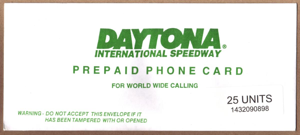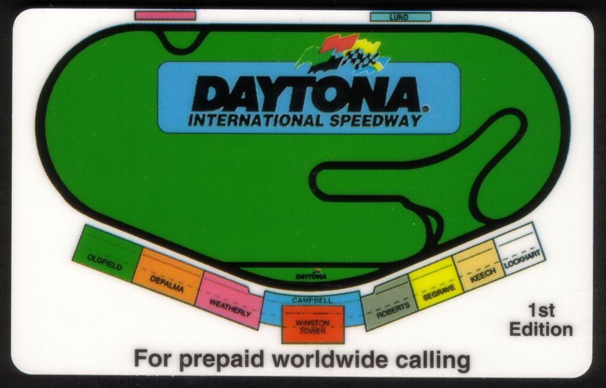 Daytona International Speedway themed prepaid phone card featuring track layout, racing legends, and official logo, emphasizing collectible and practical use. |