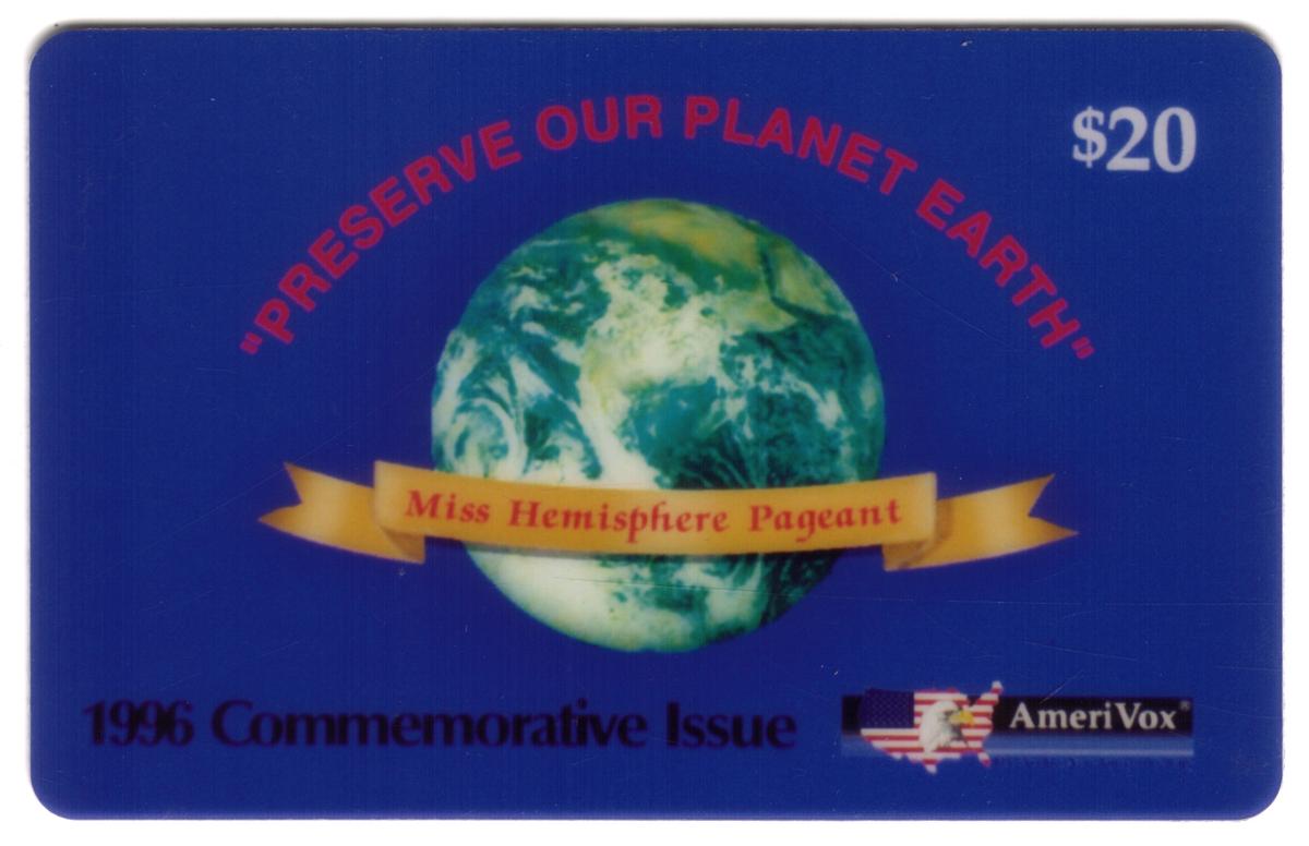 This collectible card is a 1996 commemorative issue titled "Miss Hemisphere Pageant 'Preserve Our Planet Earth' PROOF" by AmeriVox. The card features two prominent globes depicting the world, highlighting the themes of global awareness and environmental preservation. The design emphasizes the connection between the Miss Hemisphere Pageant and tourism, with a face value of $20 prominently displayed. The globes serve as a central visual element, representing the Earth and aligning with the card's conservation message.