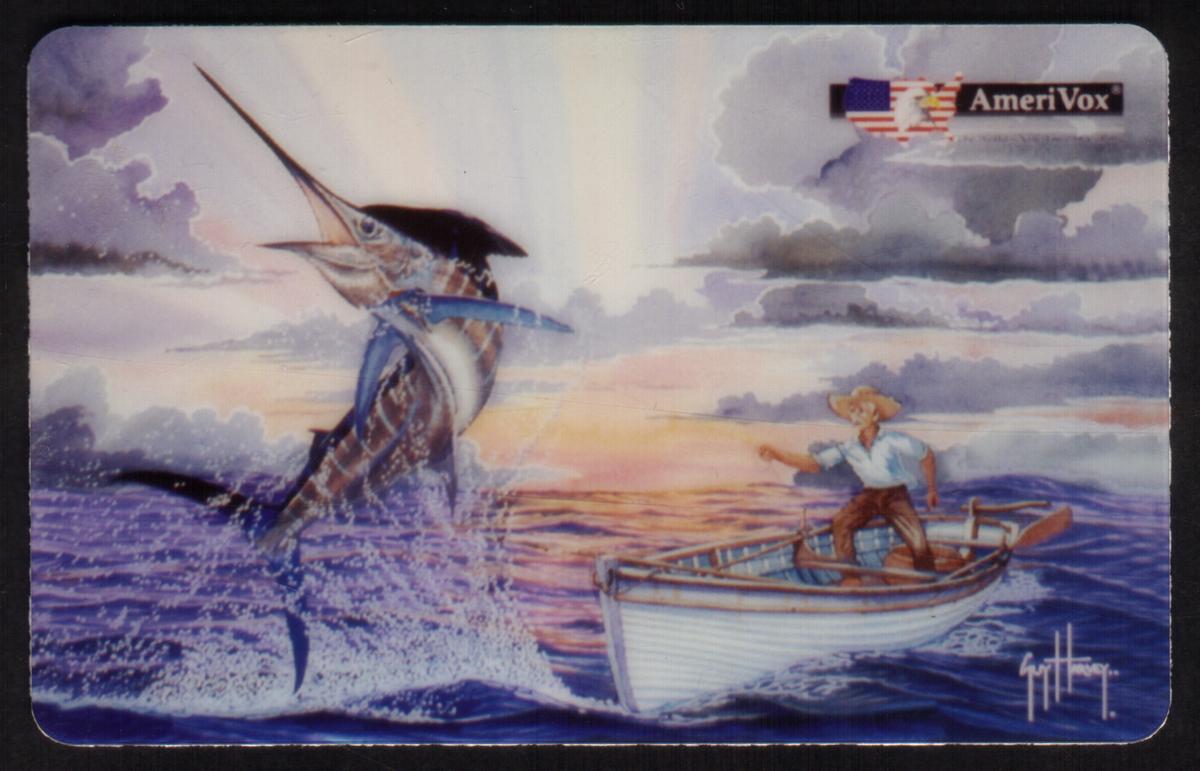 The card is associated with AmeriVox and WorldCom, indicating the telecommunications companies linked to this phone card. The overall design emphasizes both artistic representation and the sport of fishing, blending detailed artwork with branding elements related to phone card use.
