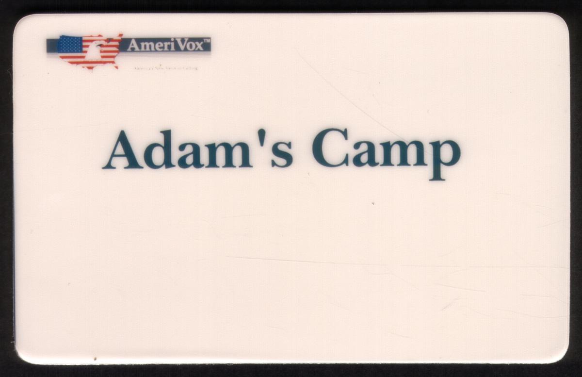 This collectible card features the text "Adam's Camp" prominently centered on a plain white background in dark blue serif font. In the top left corner, there is a small logo comprising a stylized American flag and the word "AmeriVox" in blue text with a trademark symbol. The design is minimalist, with no additional graphics or images present.