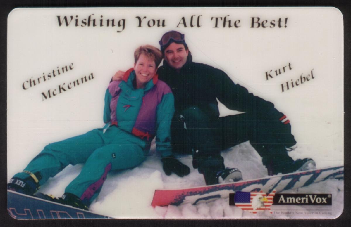The card includes the inscription "Wishing you all the best Christine McKenna & Kurt Hiebel: Snow Skiers" prominently displayed across the lower section of the image. The AmeriVox logo appears in the bottom right corner, linking the card to this collectible series. The overall design uses bright, natural lighting that highlights the snow and ski equipment clearly, emphasizing the winter sports theme.
