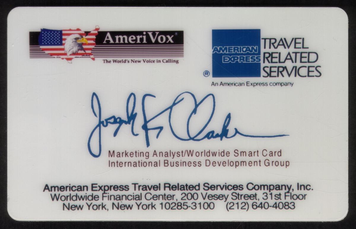 Additional text on the card highlights connections to global business activities, consistent with the role of an American Express representative in travel-related and corporate services. The card serves as a formal item tied to international business development under American Express Travel Related Services, centered in New York.