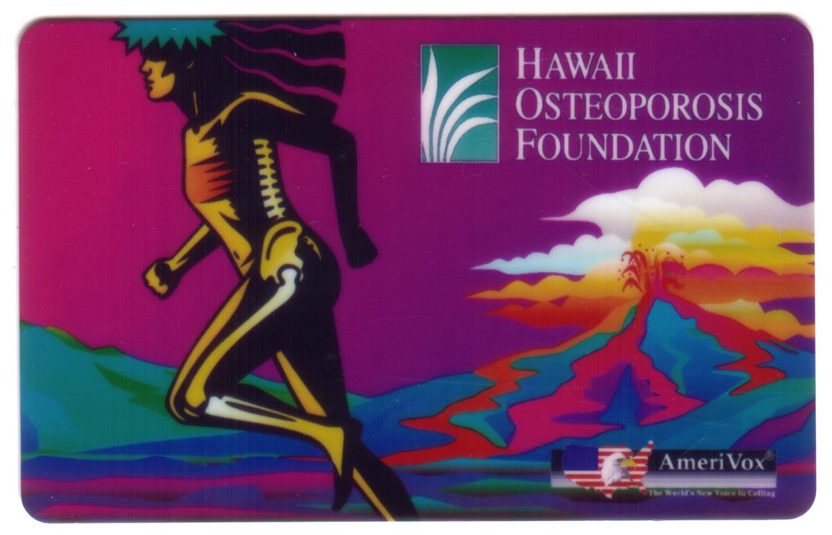 Overall, the card’s design harmonizes themes of nature, health, and athleticism, symbolized by the mountainous landscape and the runner figure, alongside the authoritative presence of the Hawaii Osteoporosis Foundation logo and AmeriVox branding. This makes it a distinctive collectible focused on promoting bone health through artistic expression.