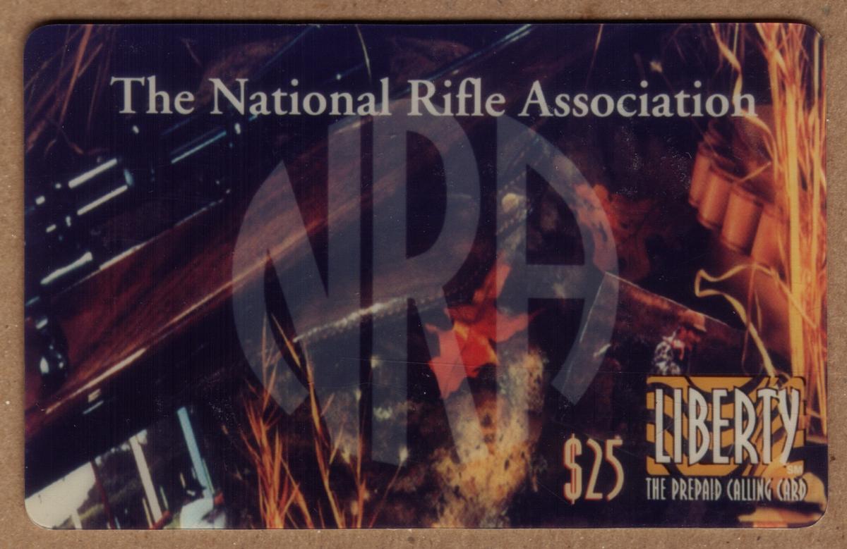 This collectible phone card features a detailed collage design prominently themed around rifles and woods, representing elements associated with the National Rifle Association (NRA). The front of the card includes the text "National Rifle Association" and displays imagery of rifles positioned in a natural, wooded environment. The background incorporates woodland scenery, emphasizing trees and forest textures, which highlight the outdoor and hunting aspect linked to the NRA’s activities and interests.