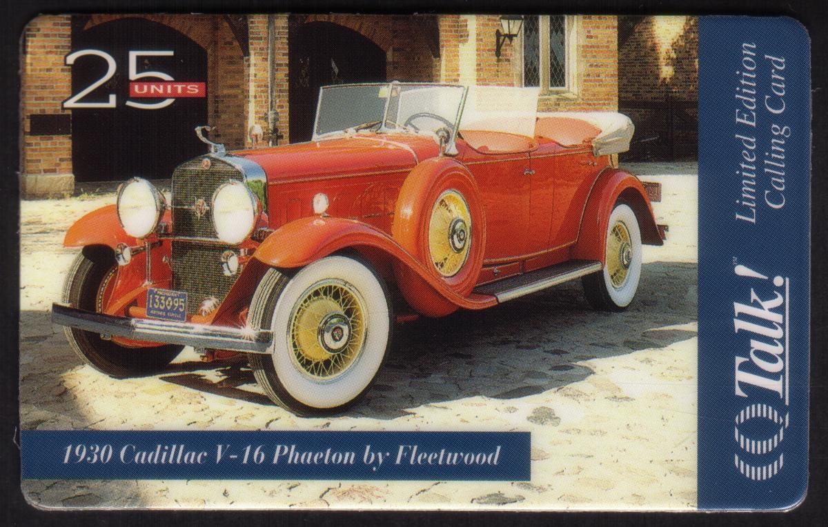 Additional text on the card includes the number "25u" and references "ConQuest Telecommun," linking the card to telecommunications but not describing its use beyond the brand. The overall presentation captures the historical significance and luxury associated with the Cadillac V-16, making this card a collectible item for enthusiasts of classic automobiles and General Motors history.