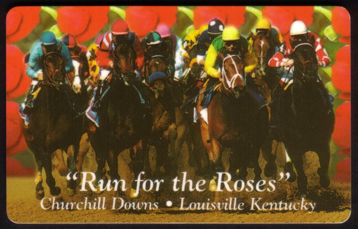 This card is designed as an interactive telecard, used in telecommunications. It shows rich colors emphasizing the excitement and tradition of the Kentucky Derby horse race. The jockeys’ silks display various patterns and colors, distinguishing each rider. The card is clearly marked as “USED” along the top edge in the design.