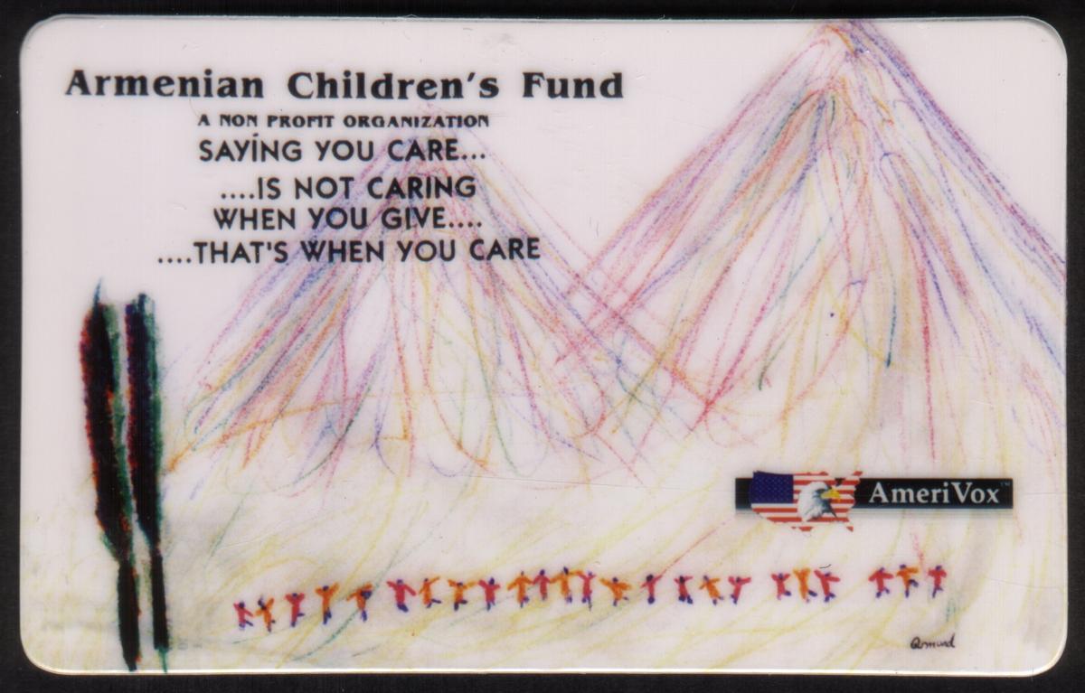 This collectible phone card features the Armenian Children’s Fund, a non-profit organization. The card prominently displays the message: “SAYING YOU CARE... ...IS NOT CARING WHEN YOU GIVE... ...THAT'S WHEN YOU CARE.” The design incorporates a childlike drawing style with colorful crayon-like lines that suggest abstract mountain shapes in the background.
