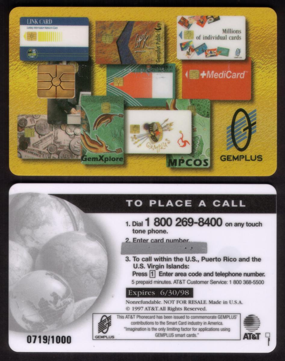 Limited edition AT&T cards honoring GemPlus smart card innovations, featuring colorful chip designs, currency imagery, and instructions from the late 1990s. |