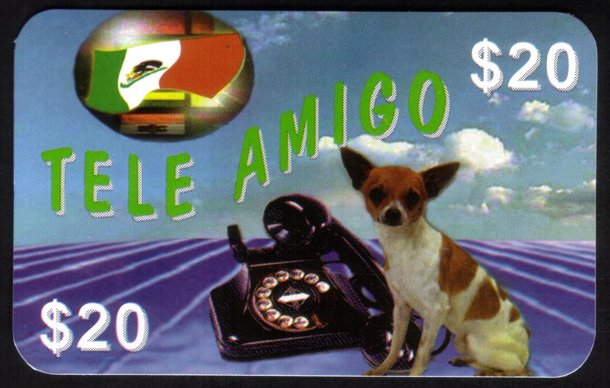 At the bottom of the card, the text reads "Tele Amigo," which complements the imagery of the dog and evokes a friendly theme. The card’s value is clearly indicated as "$20" in green text near the middle right section. Above this, the card credits "New Media Tele: Qwest" as the service provider, connecting the card to Qwest’s telecommunication network.