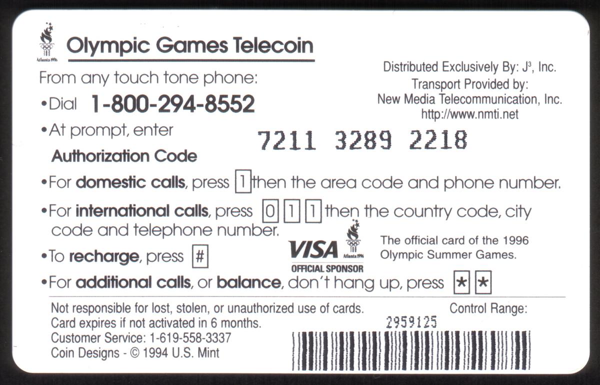 Commemorative $20 phone card featuring Atlanta 1996 Olympics coin with patriotic design, athlete imagery, and practical use details. |