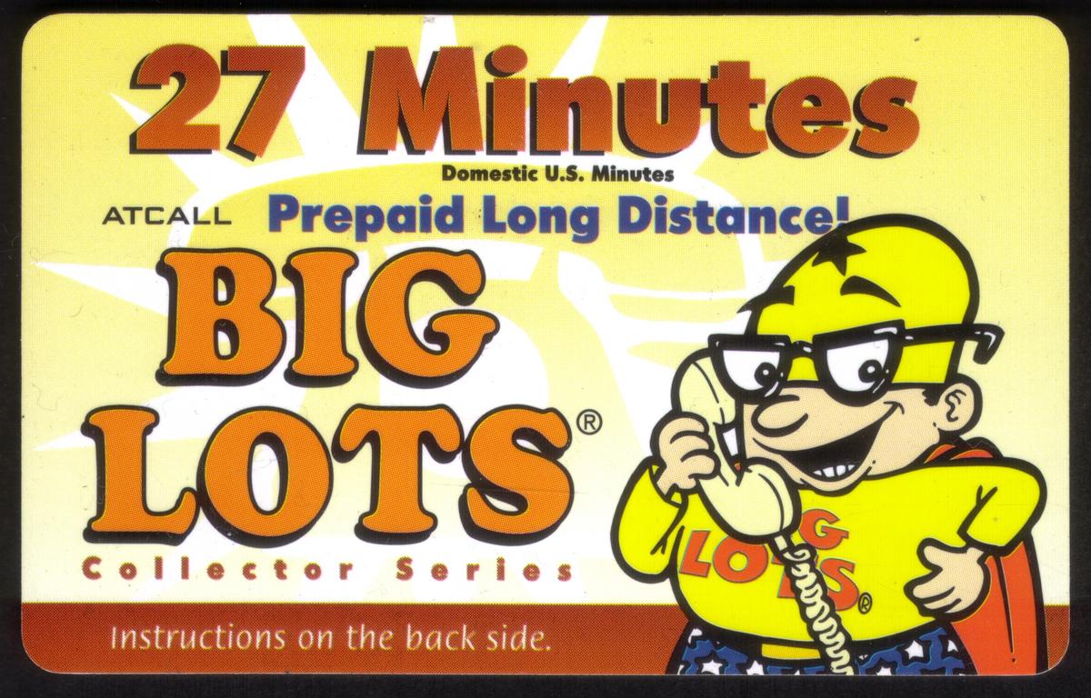 This collectible phone card offers 27 minutes of prepaid long distance calls for domestic U.S. use. It is part of the ATCALL Big Lots collector series. The card prominently displays the Big Lots logo in large orange letters with a registered trademark symbol. Above the logo, text in blue and black highlights the card’s purpose as a prepaid long distance phone card with 27 minutes included.