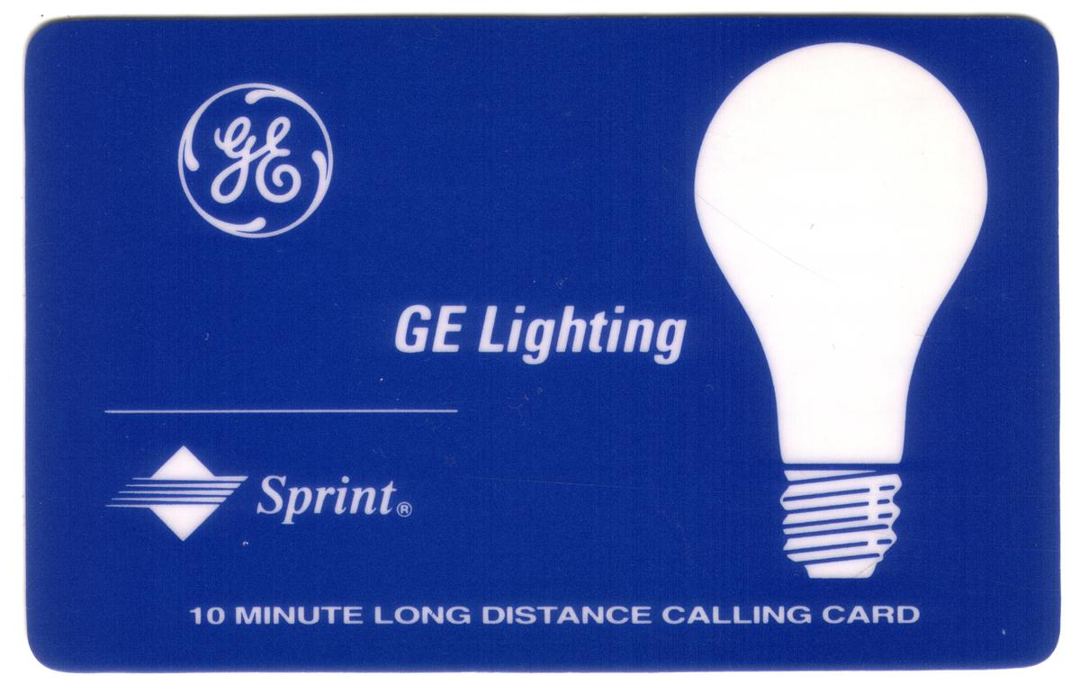 The card is a laminated promotional collectible issued by GE Lighting, featuring prominent references to promotional lighting and electrical products. The consistent typography and clear visual elements highlight its connection to corporate business cards and electronics promotion within the telecommunications and lighting sectors.