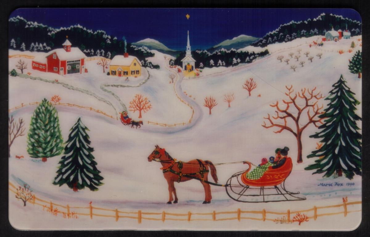 The Winter card depicts a snowy landscape with a horse-drawn sleigh carrying two people dressed warmly. The background shows snow-covered trees, a church, and buildings emitting chimney smoke, emphasizing a peaceful holiday atmosphere. The artist’s signature, Marie Fox 1991, appears on the lower right, along with the title “Winter Scene.”