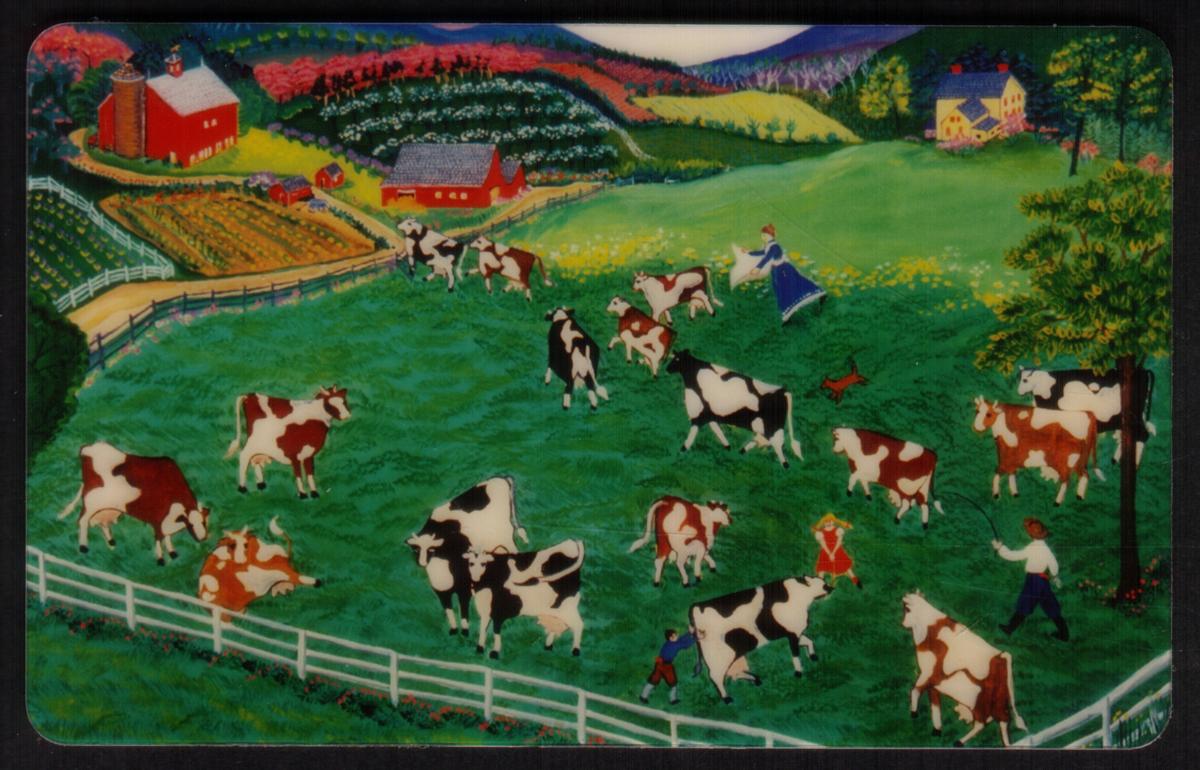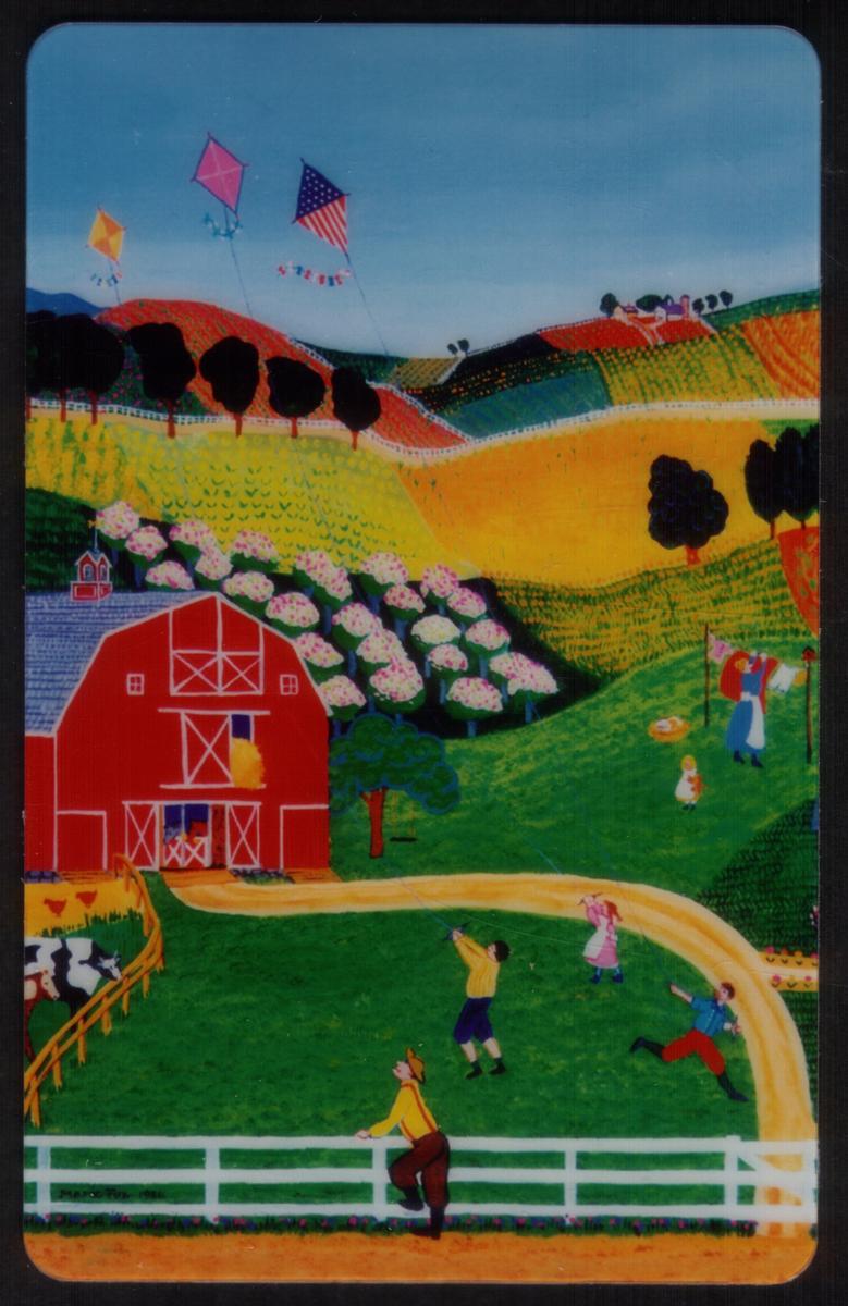 These cards are published by LDDS WorldCom and identify the series as "Four Seasons" illustrating rural life with horses, animals, barns, and nature through each season. The vivid colors and charming scenes reflect the artist’s folk style and the nostalgic feel of farm life throughout the year.