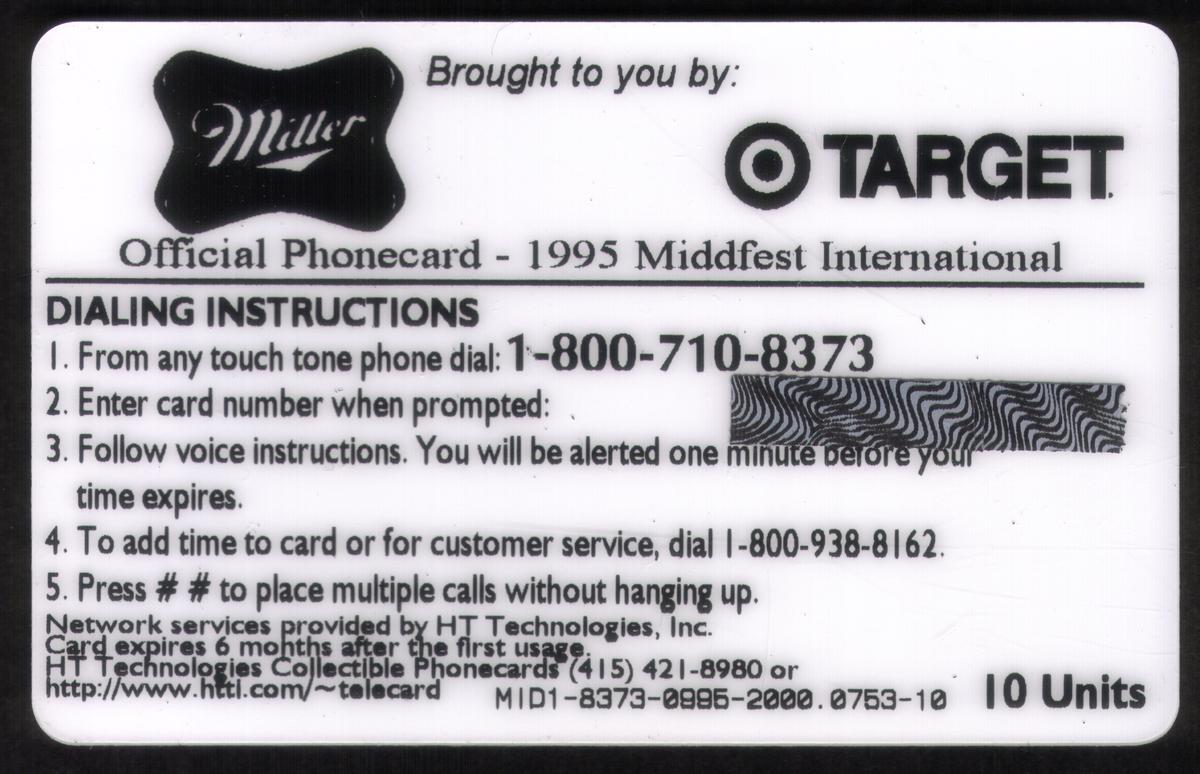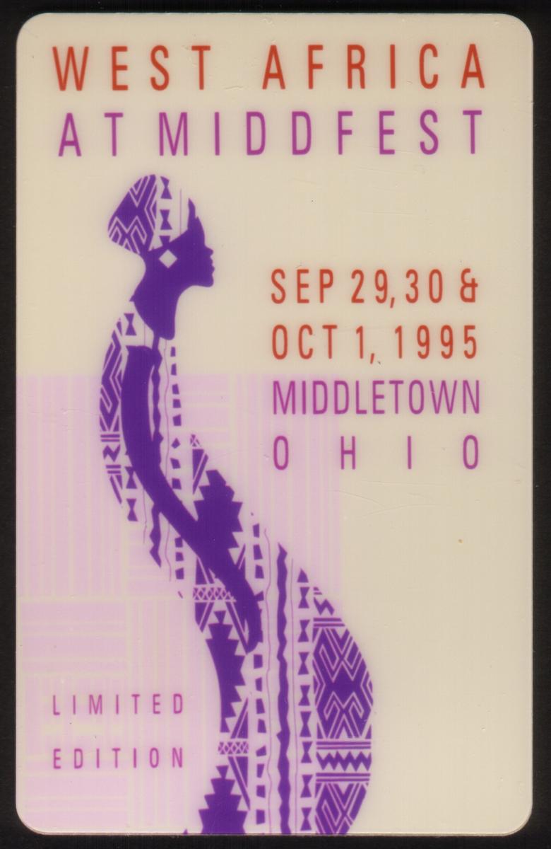 This card is linked to the 1995 Middfest international event and highlights African culture through its art and illustration style. It is associated with trademarks and logos including Miller Beer and Target, reflecting promotional collaboration during the festival dates in Middletown, Ohio.