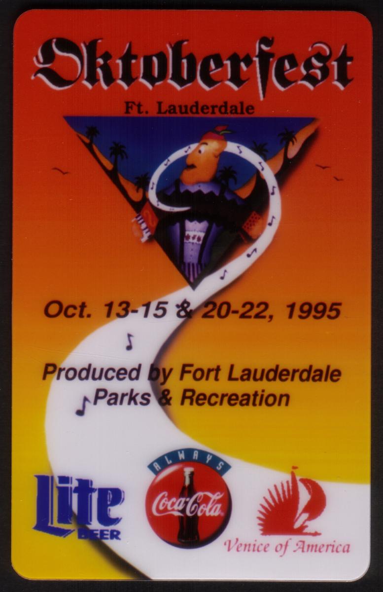 Vivid 1995 Oktoberfest Fort Lauderdale memorabilia featuring bold colors, Bavarian and Florida symbols, musical notes, festival dates, and sponsor logos. |