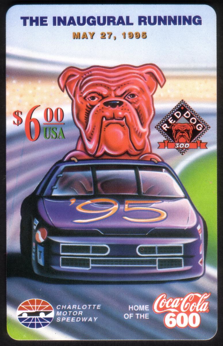 The first card highlights the inaugural running of a racing event dated May 27, 1995, with a prominently featured purple race car numbered 95. Above the car is an illustrated Red Dog mascot head with the text "RED DOG 300." The bottom of the card displays the Charlotte Motor Speedway logo and the wording "HOME OF THE Coca-Cola 600."