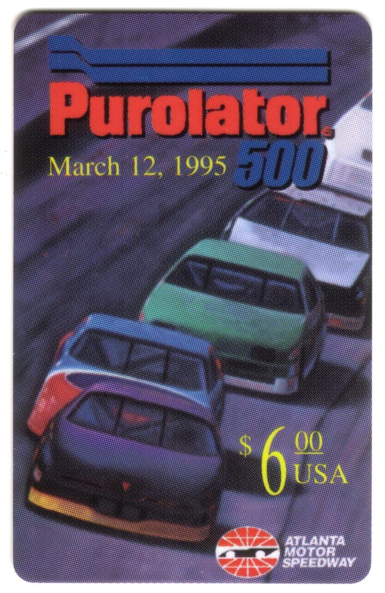 The third card depicts the Purolator 500 race, dated March 12, 1995. It features a dynamic racing scene with three stock cars in action on the Atlanta Motor Speedway track. The Purolator logo in red and blue is at the top, while the Atlanta Motor Speedway logo is at the bottom.