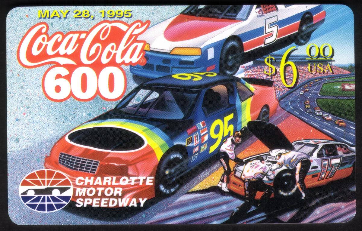 The second card is dated May 28, 1995, and depicts a racing scene with cars on a track, including a blue and orange car numbered 95 and a white car numbered 5. The Coca-Cola 600 logo appears prominently, again alongside the Charlotte Motor Speedway logo.
