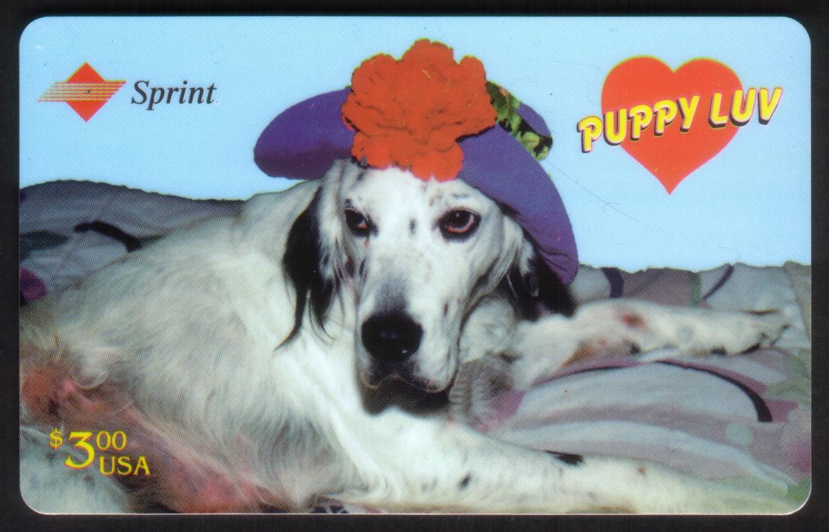 Additional details include the Sprint branding clearly visible on the card. The value of the card is $3, and it belongs to a series related to animals, dogs, puppies, and dog breeds. The overall design reflects a theme of “puppy love,” combining pets and floral elements to create a playful and affectionate collectible item centered on the English Setter breed.