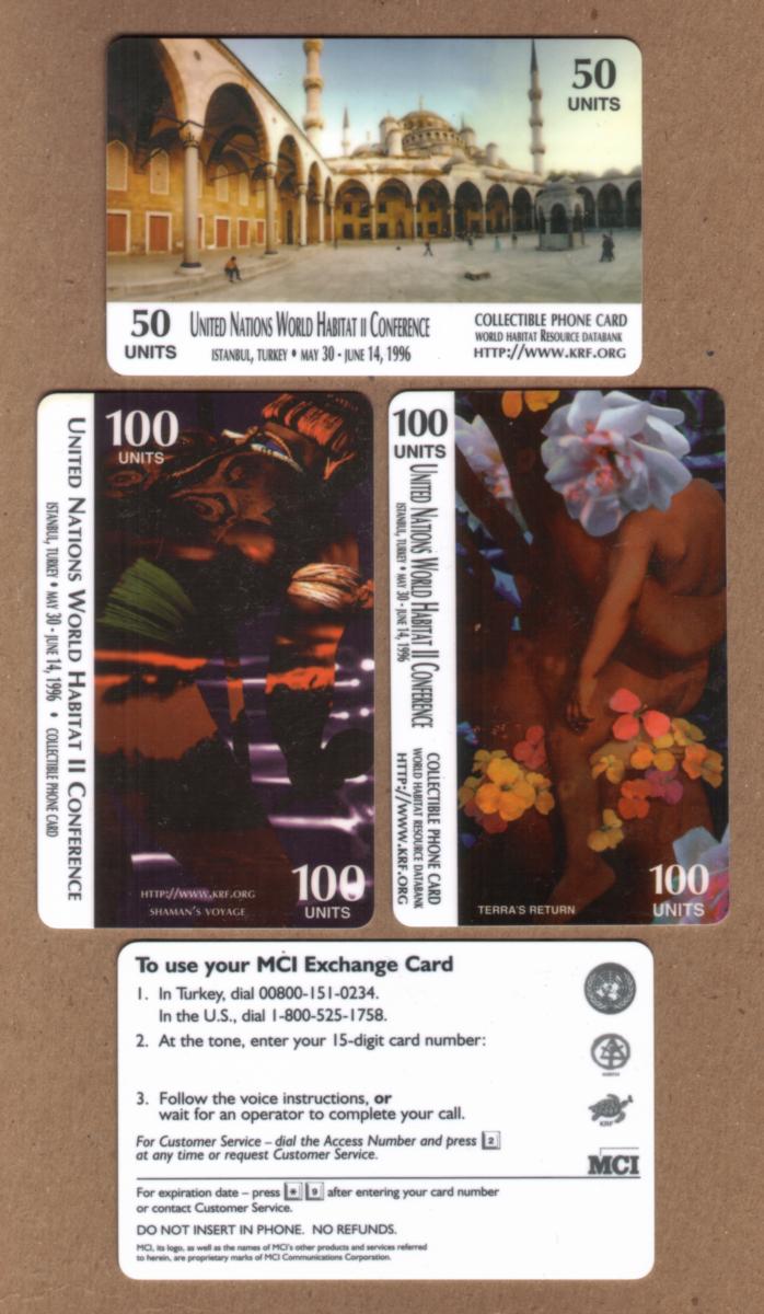 All three cards are associated with the United Nations World Habitat II Conference held in Istanbul, Turkey from May 30 to June 14, 1996, and are part of a series featuring the World Habitat Resource Databank.