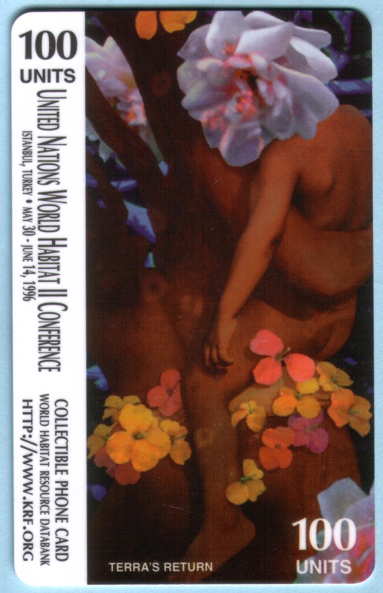 The third collectible phone card features artwork titled "Terra's Return," showing a depiction of a nude figure partially obscured by large flowers. The figure appears intertwined with nature, surrounded by vividly colored blossoms in shades of pink, yellow, and orange, and is set against a dark background. The card is valued at 100 units and includes similar vertical text along the left edge stating "UNITED NATIONS WORLD HABITAT II CONFERENCE, ISTANBUL, TURKEY • MAY 30 - JUNE 14, 1996." The phrase "COLLECTIBLE PHONE CARD WORLD HABITAT RESOURCE DATABANK" and the website "HTTP://WWW.KRF.ORG" appear at the bottom.