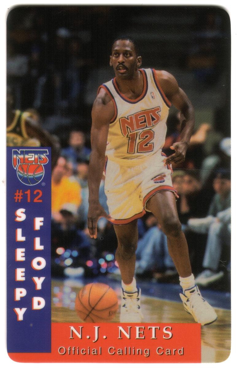 At the top left corner of the card, the logo of the New Jersey Nets is displayed. The card also includes the text "NJ Nets" in white letters with a blue and black trim. In the bottom section, the player's full name "Sleepy Floyd" appears in white text against a blue banner background. The card has additional branding including the logos of “Public Switch Corporation” and “Global Key” indicating promotional use linked to telecommunications.