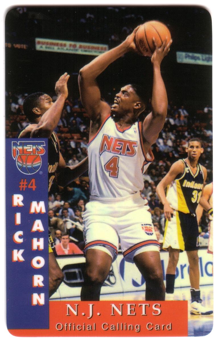 The image presents an action-oriented layout emphasizing basketball with the player’s name, Rick Mahorn, clearly printed alongside his jersey number. The New Jersey Nets logo is also visible on the card, reinforcing the team affiliation. The card uses a mix of colors including white, red, and black, aligning with the Nets’ branding during Mahorn’s tenure with the team.