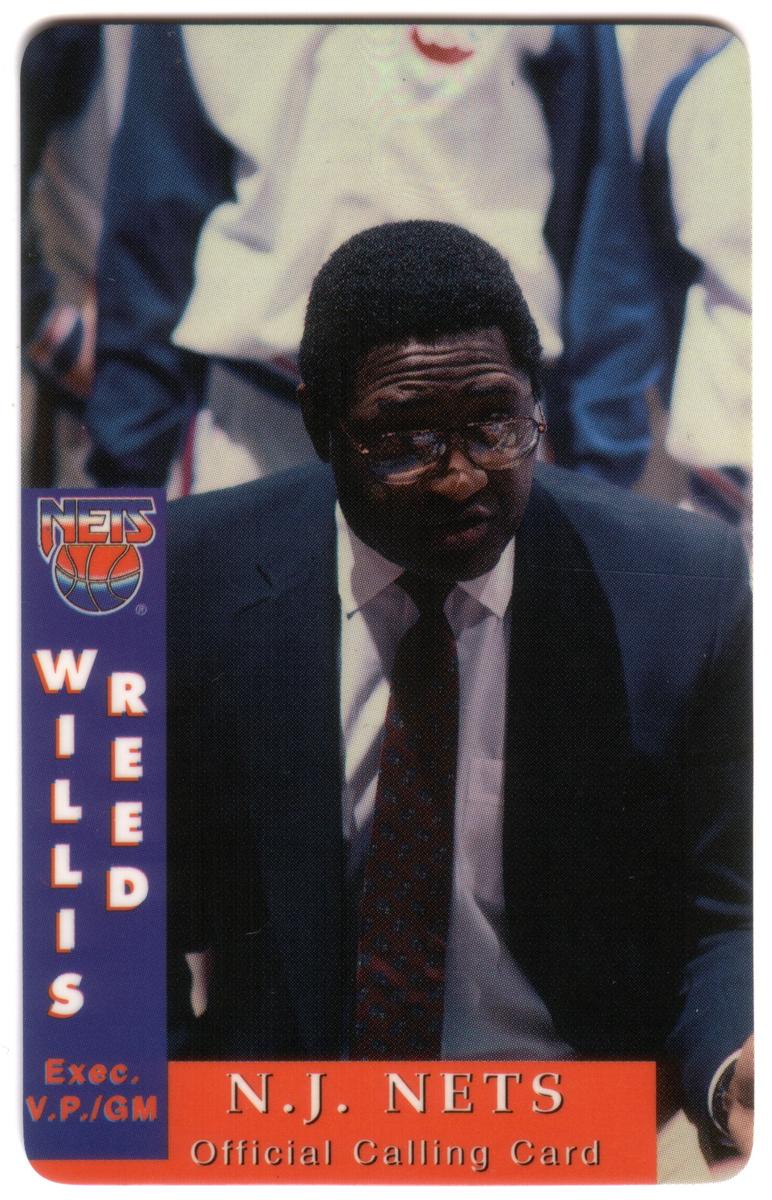 The card’s layout incorporates a black background with photographic imagery or graphic elements related to basketball. Willis Reed is presented in a formal portrait style, wearing a suit and tie, emphasizing his executive role rather than as an athlete. The text on the card highlights his position with the New Jersey Nets and associates him with the basketball sports category.
