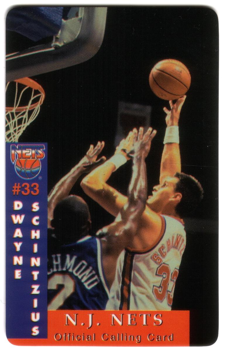 The overall layout presents the player image alongside the team name "NJ Nets" and the player's full name, Dwayne Schintzius. The card is promotional in nature, combining sports and communications industry elements.