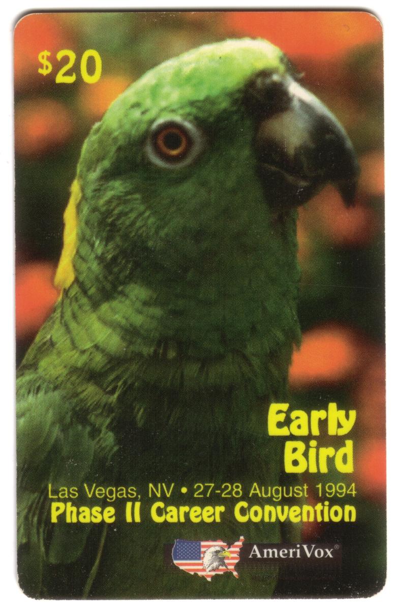 This collectible card features a vibrant image of a green parrot, a bird known for its bright plumage. The parrot is centered prominently on the card, showing detailed feathers and a clear view of its head and beak. Above the parrot's image, the text reads "Las Vegas Career Convention 1994 'Early Bird,'" indicating the event related to the card. Below this, “$20” is printed, denoting the card’s value.