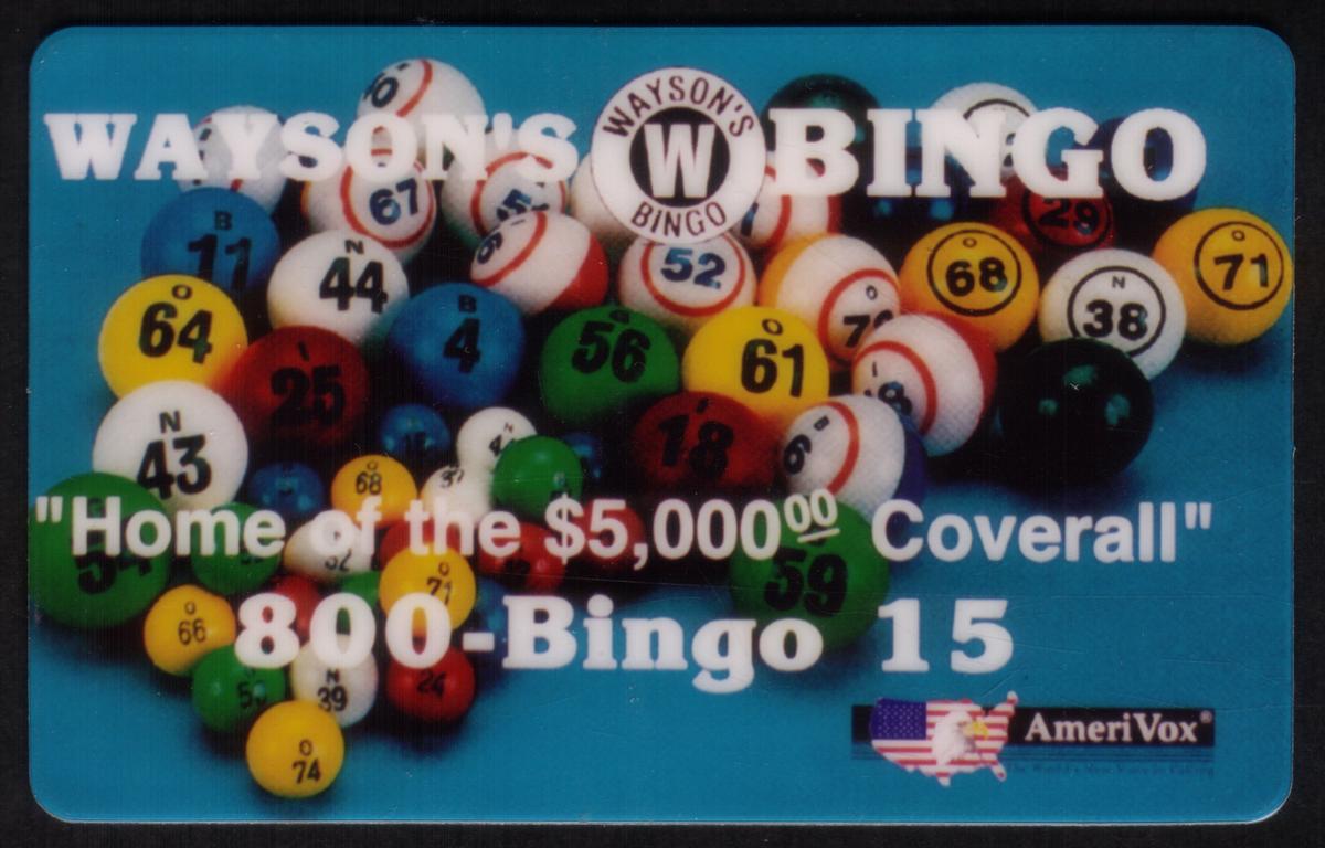 This collectible card features a vibrant and colorful design centered on bingo balls. The front displays a cluster of multicolored bingo balls, each clearly marked with bold white numbers. The balls are arranged to emphasize variety, including numbers such as 15 and 10, reflecting typical bingo gameplay elements. The card prominently includes the text “800-BINGO” and “Wayson’s Bingo,” linking it directly to the brand associated with a bingo gaming service or promotion.