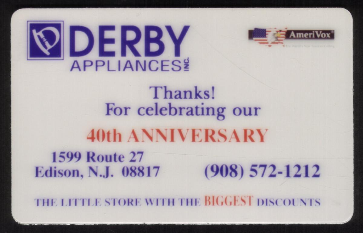 This collectible card features a corporate design celebrating the 40th anniversary of Derby Appliances, located in Edison, New Jersey. The card’s artwork prominently displays the Derby Appliances logo alongside the phrase "40th Anniversary." The image includes the tagline, "the little store with the biggest discounts," and references "Route 27," which relates to the store’s location. The design incorporates corporate trademarks associated with Derby Appliances and AmeriVox.