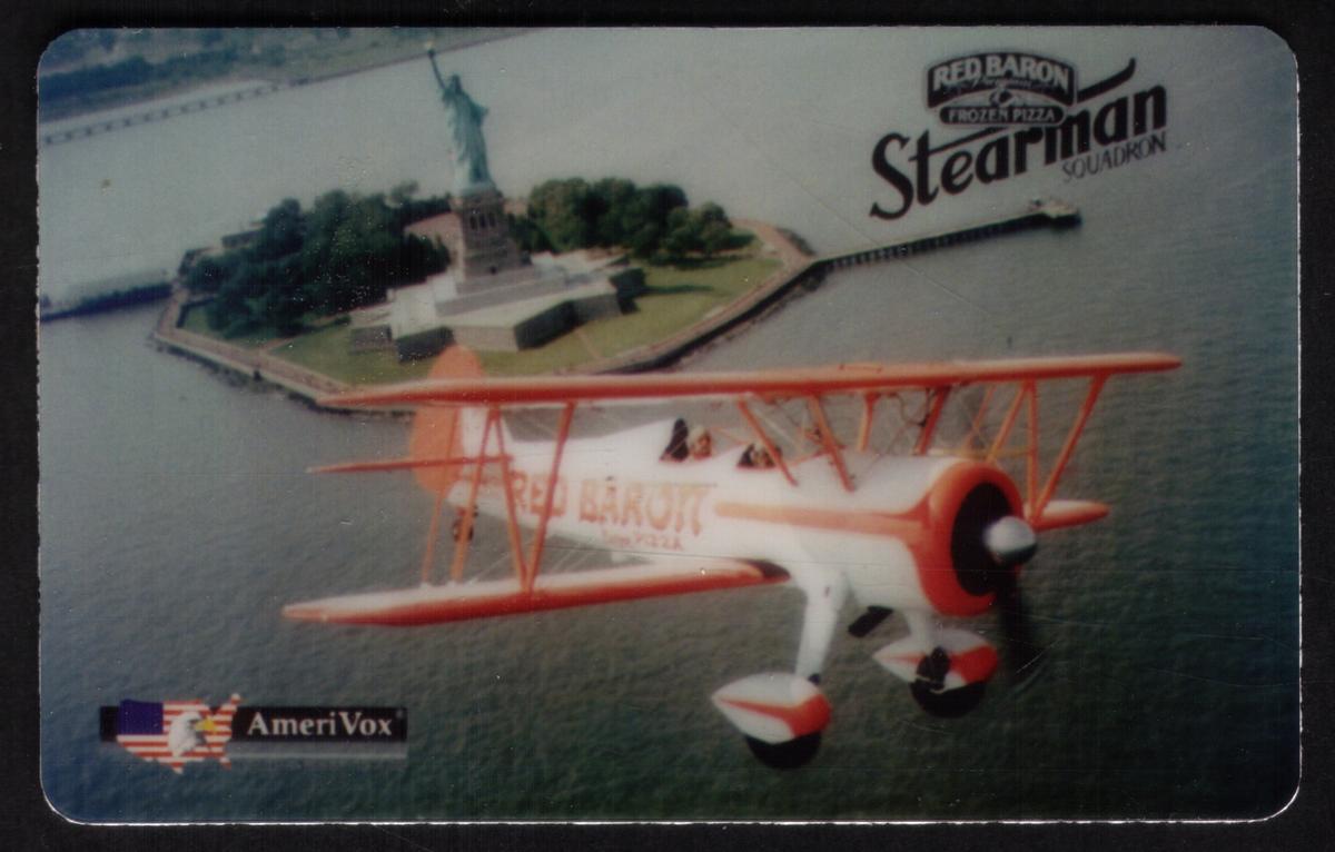 This chip card is a collectible item representing a cross-section of aviation, pizza dining promotionals, and American symbolism. It is produced by AmeriVox and is connected to the Stearman Squadron theme. The card is identified clearly with the words Red Baron Pizza and the depiction of the Stearman biplane in flight near the Statue of Liberty, making it a unique collectible within corporate promotional cards and aviation-themed memorabilia.