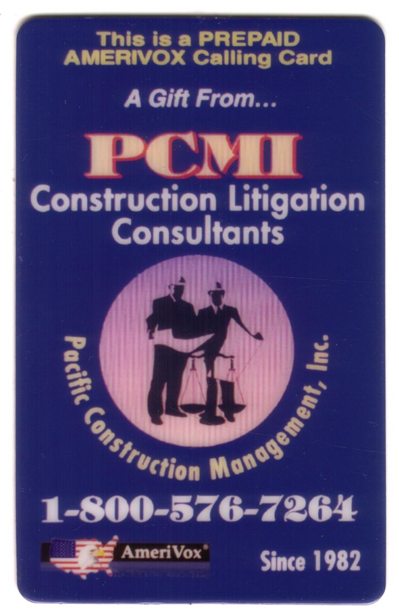 Additional text on the card includes "PCMI Construction Litigation Consultants - Lawyers & Scale PROOF," emphasizing the firm's focus on litigation consulting and legal services related to construction disputes. The card also bears the "AmeriVox" logo, representing the telecommunications or phone card provider associated with this item. The overall design is clean and corporate, reflecting the professional nature of PCMI’s business in the legal and construction management fields.