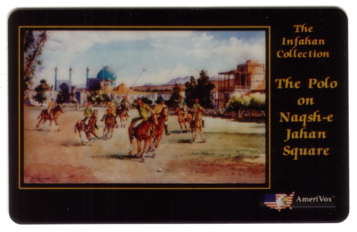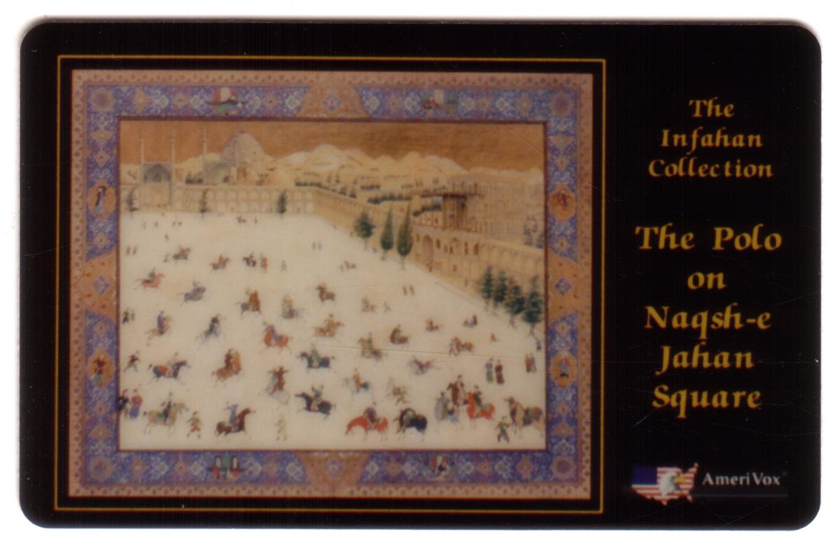 The first card shows an artistic depiction of a polo match taking place on Naqsh-e Jahan Square, with numerous horsemen actively engaged in the sport set against a detailed backdrop of architectural elements and trees. The border of the artwork is decorated with intricate patterns evoking traditional tile art. The text on the card reads: "The Infahan Collection," and "The Polo on Naqsh-e Jahan Square."