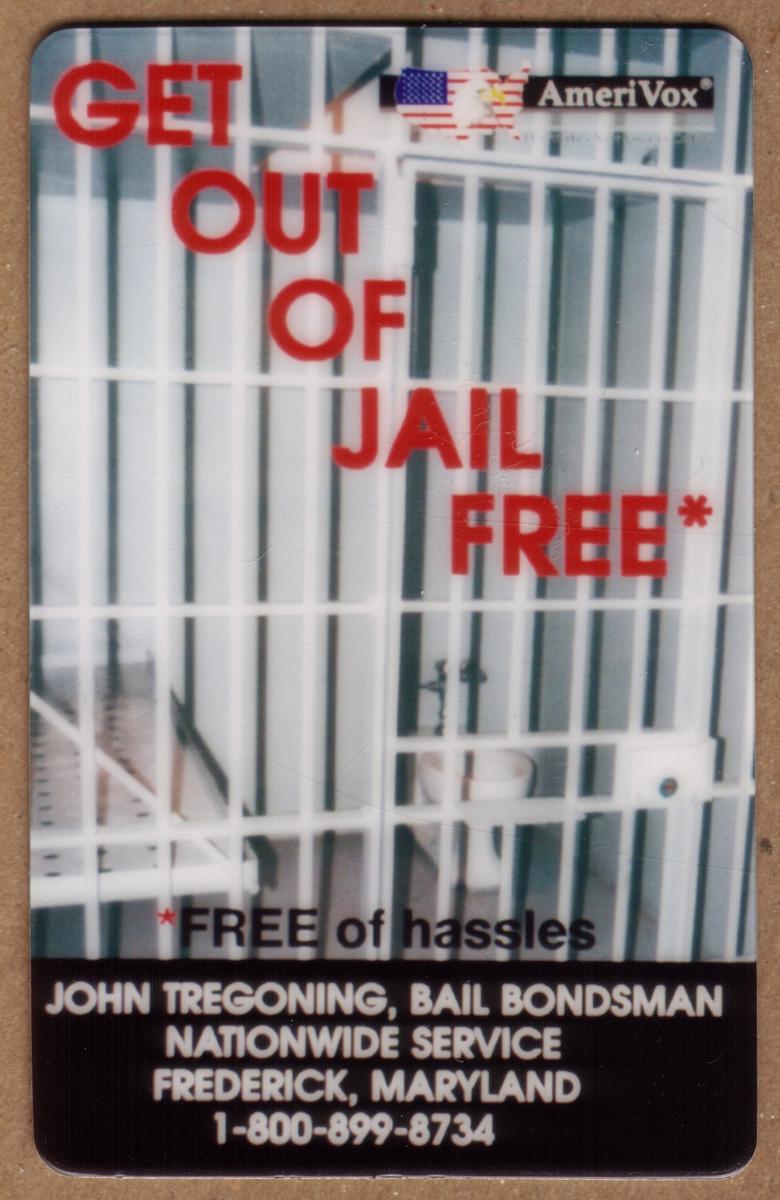 This card serves as a symbolic representation tied to bail bonding services in Maryland, featuring John Tregoning as the bondsman. The presence of AmeriVox suggests it is part of a collectible series issued by this company. The card’s text and imagery convey a strong message about freeing individuals from jail, encapsulated in its “Get Out of Jail Free” statement and related visuals.