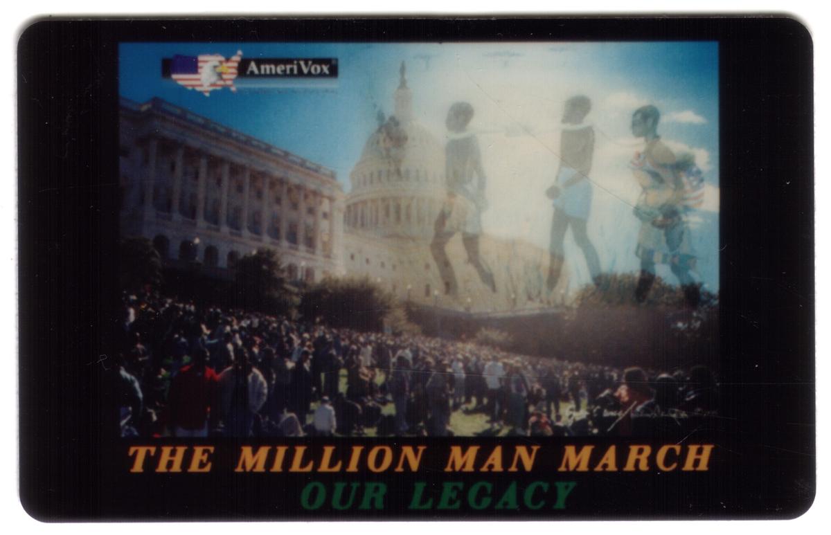 In addition to the scene of the march, the card includes the AmeriVox branding and a decorative border featuring patterns of red and blue, lending a patriotic theme to the design. The overall visual and textual elements emphasize political action and the historical importance of the Million Man March held at the Capitol.