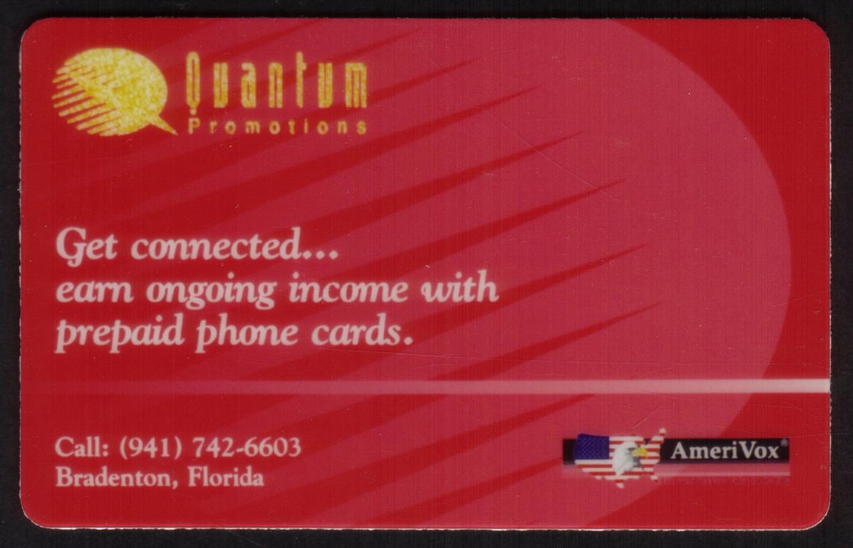 This collectible prepaid phone card connects to the broader context of business communications and marketing tools, pointing to the innovative use of prepaid phone cards as a medium. The association with Quantum Promotions and AmeriVox links it to specific companies involved in these industry sectors.