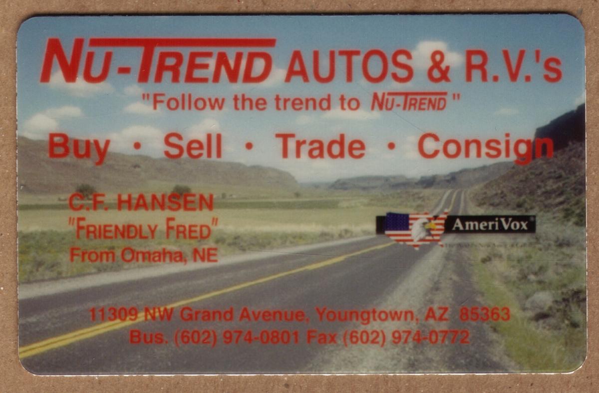 This collectible chip card features branding for Nu-Trend Autos & RV's with the name Friendly Fred Hansen prominently displayed. The card includes references to locations in Youngstown, Arizona, and Omaha, Nebraska. The design integrates automotive themes, highlighting autos, automobiles, car dealers, and automobile sales, reinforcing the connection to the automotive industry and car sales businesses.