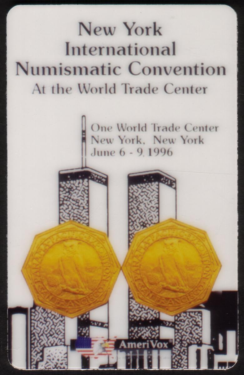 Commemorative card from 1996 NY International Numismatic Convention at WTC, featuring Twin Towers, gold coins, American flag, and AmeriVox branding. |