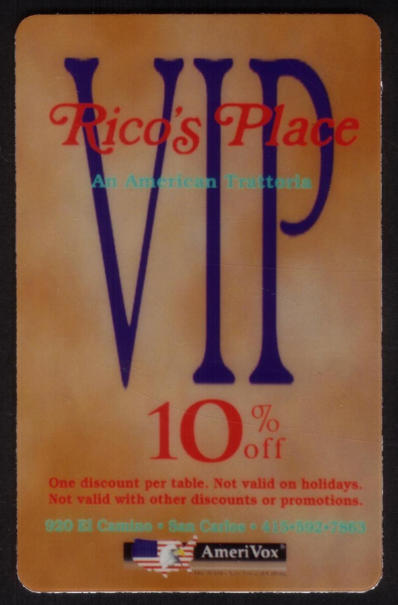 This collectible promotional discount card is from Rico's Place, an Italian restaurant located in San Carlos, California. The card offers a 10% VIP Discount specifically for dining at this American Trattoria. The front of the card prominently displays the restaurant's name, "Rico's Place," along with the subtitle "An American Trattoria," indicating its Italian cuisine focus. The discount is clearly stated as a 10% VIP offer, emphasizing its use for dining purposes.