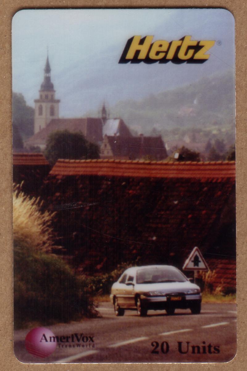 This phone card connects travel and transportation themes, referencing Hertz rental cars and utilizing AmeriVox telecom branding. It represents an intersection of automotive mobility and telecommunication services.